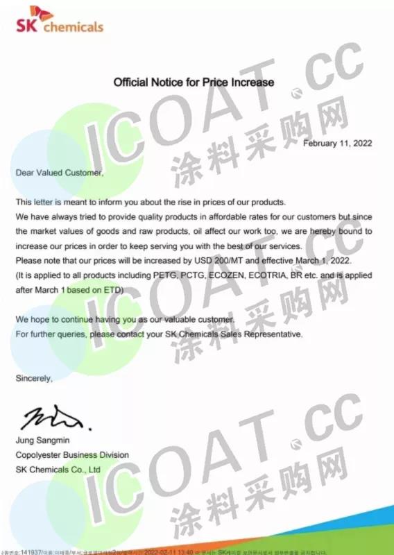 韩国SK化学:自3月1日起,PETG、PCTG等材料上调200美元/吨(约人民币1270元/吨)。