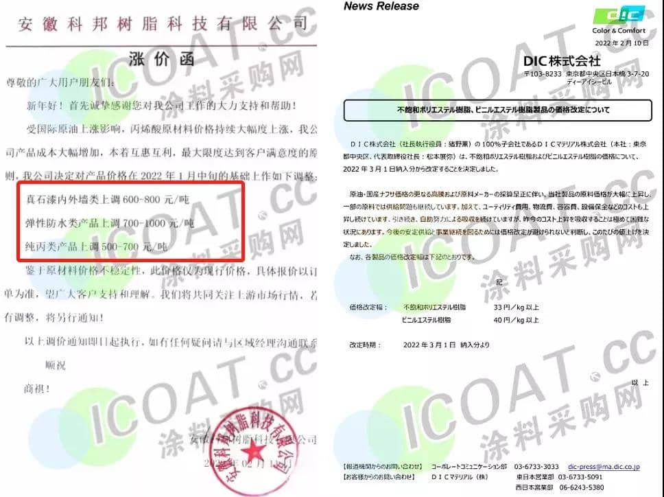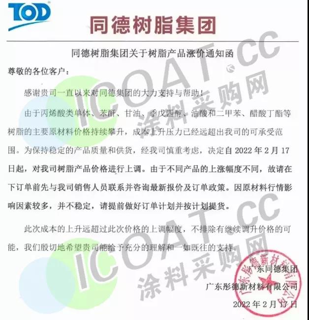 安徽科邦树脂、DIC、可乐丽等多家国内外化工企业宣布树脂产品涨价,聚酯树脂和环氧树脂产业链上的原材料也全盘涨价,最高上涨7866元/吨。