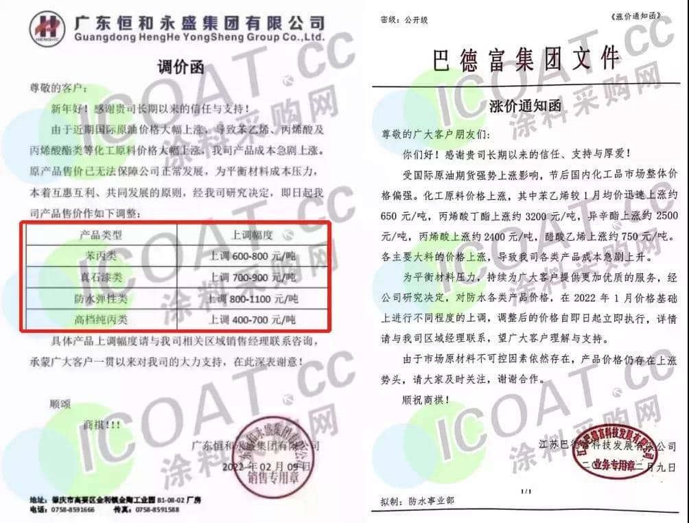 巴德富、衡水新光新材料、广东恒和永盛集团等乳液龙头频频发函宣布产品涨价,苯丙类、防水弹性类、高档纯丙类、真石漆类等产品普涨600-1100元/吨。乳液原料苯乙烯、丙烯酸、甲基丙烯酸等多种化工品也出现上涨趋势,最高上涨3800元/吨。