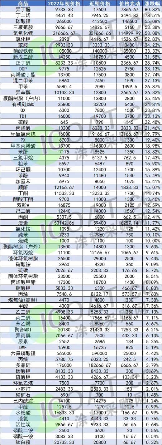 2022年部分化工品涨幅榜
