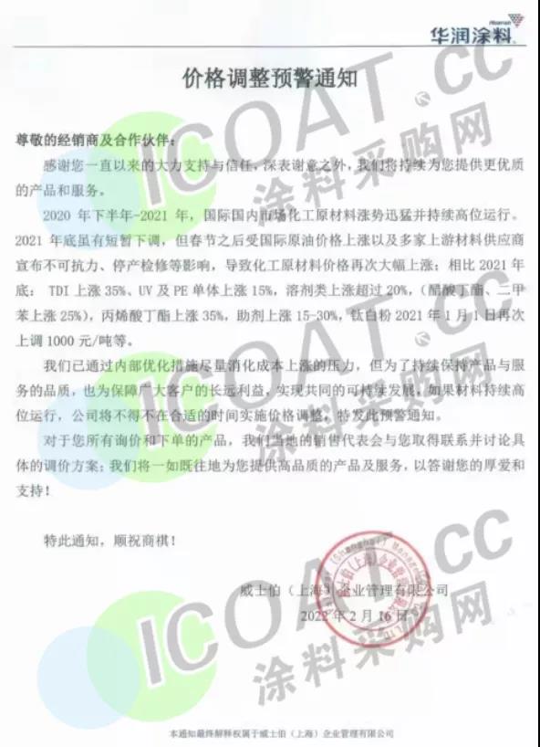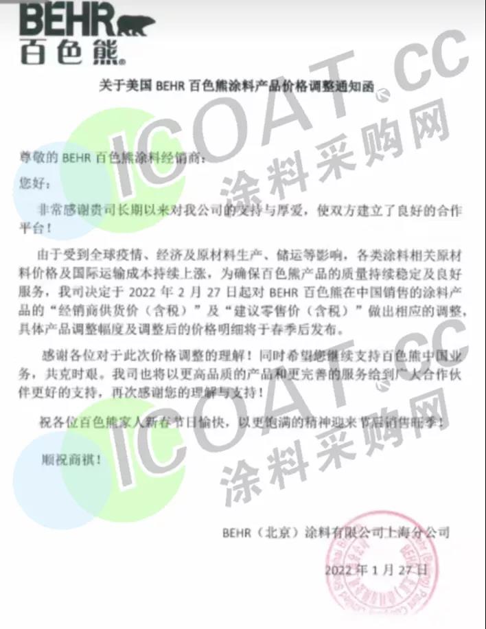 BEHR(北京)涂料有限公司上海分公司:2月27日起,对BEHR百色熊在中国销售的涂料产品的“经销商供货价(含税)”及“建议零售价(含税)”做出相应的调整,具体产品调整幅度及调整后的价格明细将于春季后发布。
