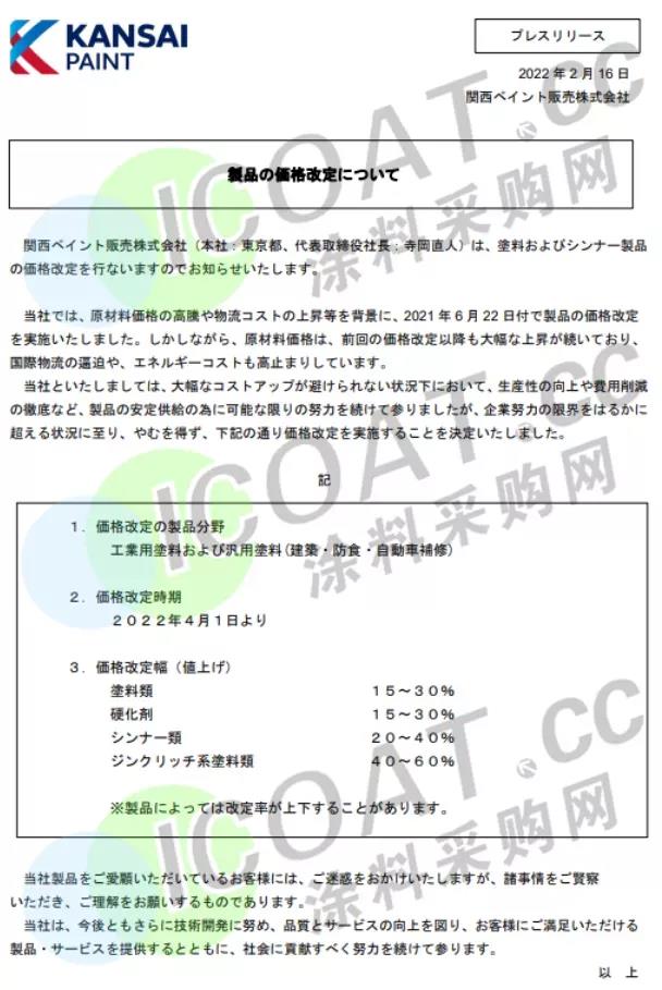 关西涂料:将于4月1日起实施涨价,最高上涨60%。
