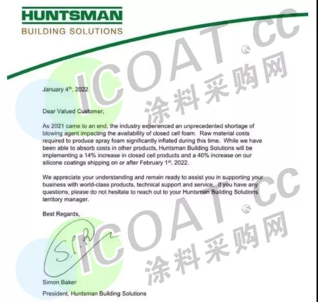 亨斯迈:有机硅涂料价格提高40%。