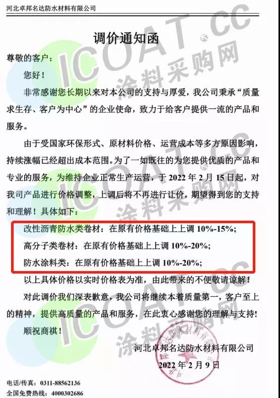 河北卓邦名达防水材料:对产品价格进行调涨,上调后将不再进行让价。改性沥青防水类卷材在原有价格基础上上调10%-15%;高分子类卷材在原有价格基础上上调10%-20%;防水涂料类在原有价格基础上上调10%-20%。