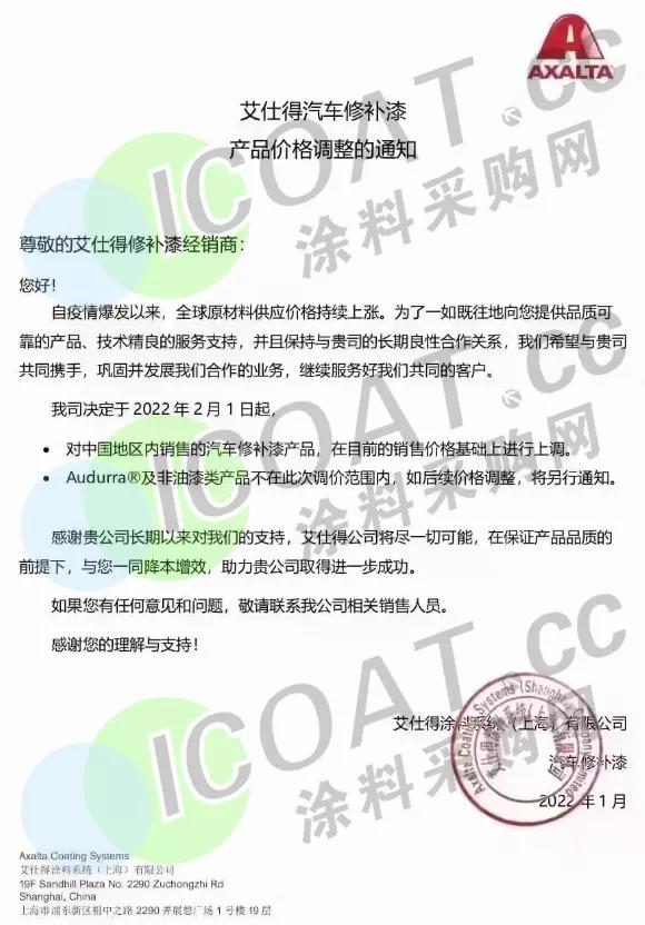 艾仕得:对中国地区内销售的汽车修补漆产品在目前的销售价格基础上进行上调。