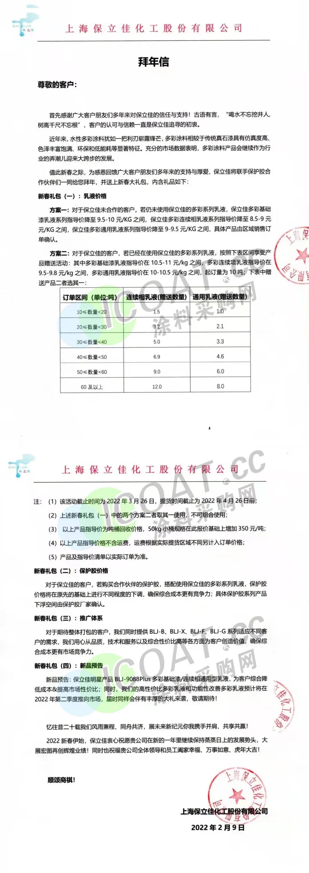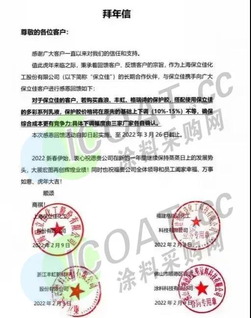 这份名为《拜年信》的降价函发布于春节假期期间,但并未在市场中大规模传播。函件明确,未合作的客户,部分乳液最低降至8.5元/KG,合作客户享受产品赠送活动。另外对于保立佳的客户,若购买鑫浪、丰虹、格瑞诗保护胶并搭配使用多彩系列乳液,保护胶价格将下调10%-15%不等。活动截止日期为3月26日,提货日期截止为4月26日前,同时表示,价格下调是为了确保综合成本更有竞争力,并为客户创造价值。
