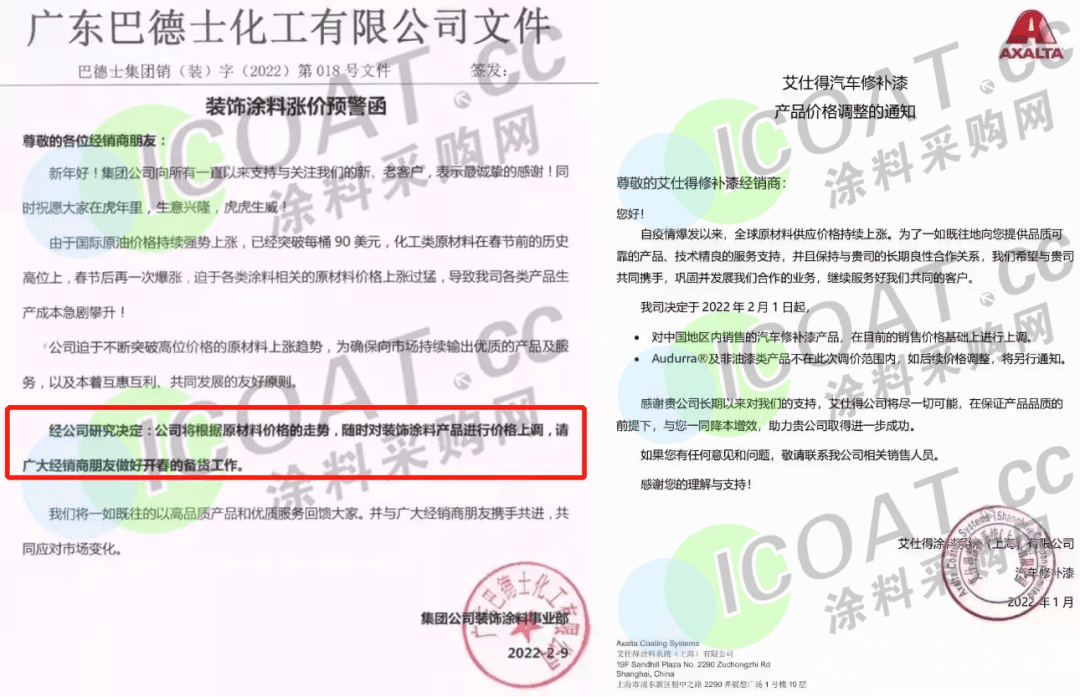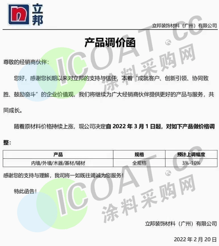 关西涂料:将于4月1日起实施涨价,最高上涨60%。BEHR:对BEHR百色熊在中国销售的涂料产品的“经销商供货价(含税)”及“建议零售价(含税)”做出相应的调整。