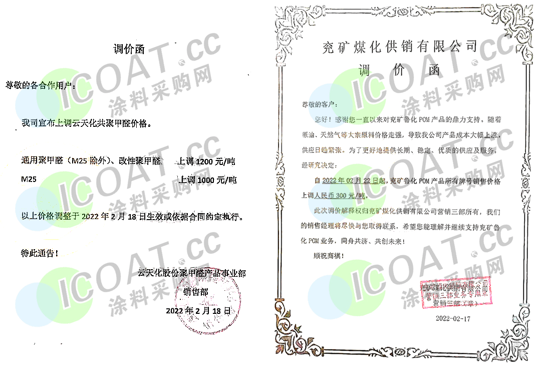 兖矿煤化供销有限公司:自2月22日起,POM产品所有牌号销售价格上调300元/吨。