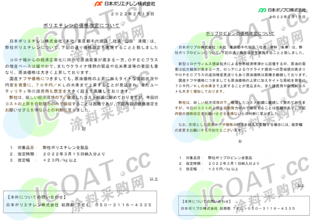 聚丙烯株式会社:自3月1日起,所有PP产品上调25日元/kg,约合1373元/吨。