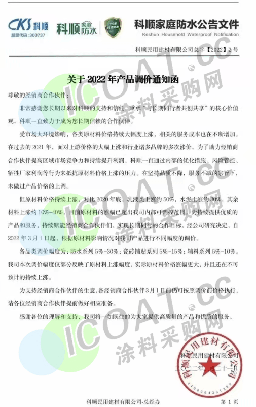 近日,科顺防水发布调价通知函,宣布自2022年3月1日起,对公司产品进行不同幅度的调价。其中,防水系列上调5%~30%,辅料系列5%-10%。