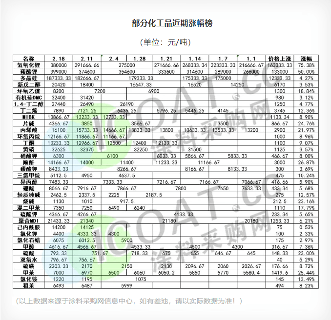 据涂料采购网不完全统计,当前30余种化工品价格较去年年末有所上涨,不同的是,有些是延续去年年末涨势,连涨7周,比如氢氧化锂,碳酸锂等,这也验证了在新能源赛道拉动之下,上游原料涨势难停的行情走势。丁二烯、丙烯酸等石油产业链上的产品也普遍在1月中旬开始涨价,与石油价格高位震荡相符合。另外一些石油产业链上的化工品自2月份开始涨价,例如混二甲苯、环氧乙烷等,基本是由产业链传导所致。