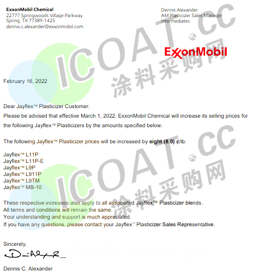 埃克森美孚:自3月1日起佳发(Jayflex)™系列增塑剂售价上调8美分/磅(约合1110元/吨)。