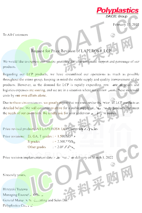 日本宝理塑料公司:自3月1日起,LAPEROS®系列的所有LCP(液晶聚合物))产品价格上调,最高上涨高达15817元/吨。