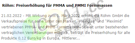 罗姆化学:自3月1日起,将提高欧洲、中东和非洲地区的PMMA和PMMI模塑料价格,上涨0.12欧元/公斤(约合860元/吨)。