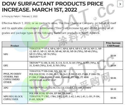 陶氏:从3月1日起,提高在北美所有表面活性剂产品的价格。最高上涨0.1美元/磅,约人民币1400元/吨。