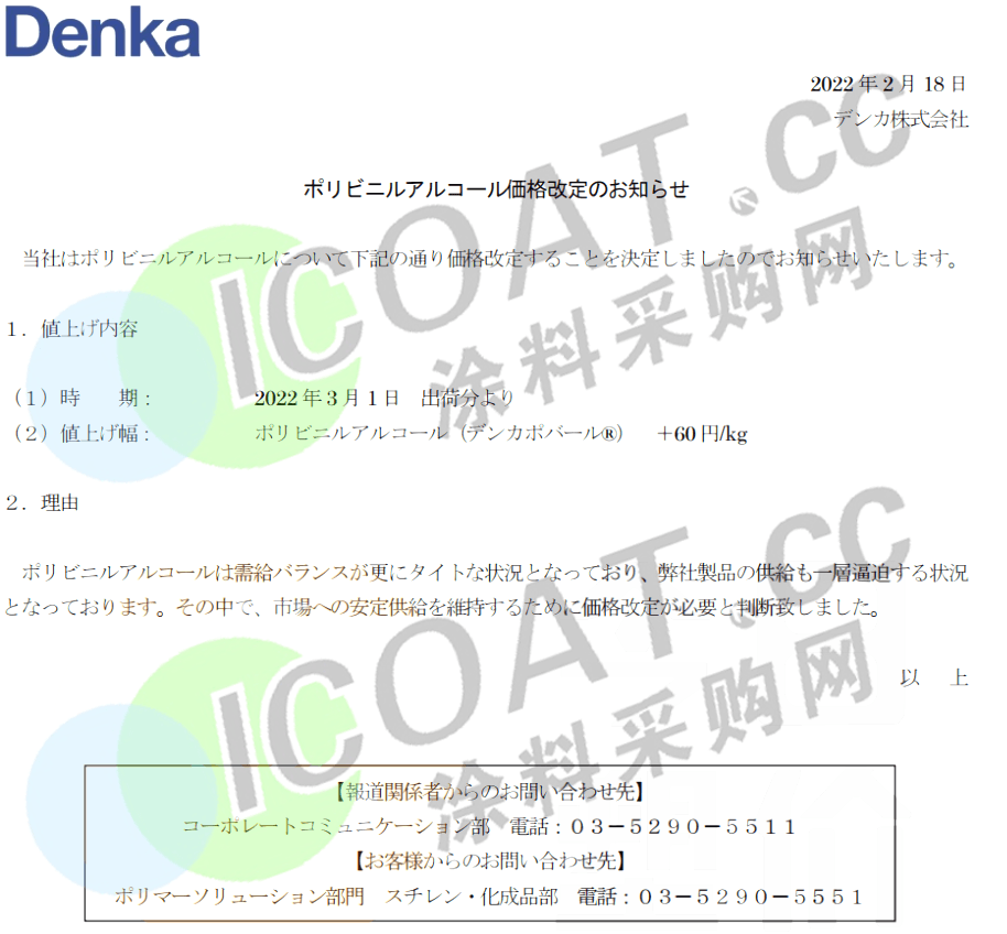 日本电化(DENKA):从3月1日起,上调聚乙烯醇(PVA)的售价60日元/kg,约合人民币3301元/吨。