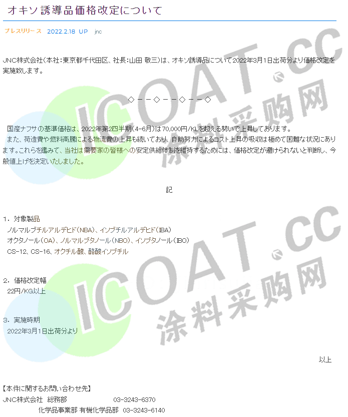 JNC:从3月1日起上调oxo衍生品的价格,上涨22日元/kg(约合1210元/吨)以上。