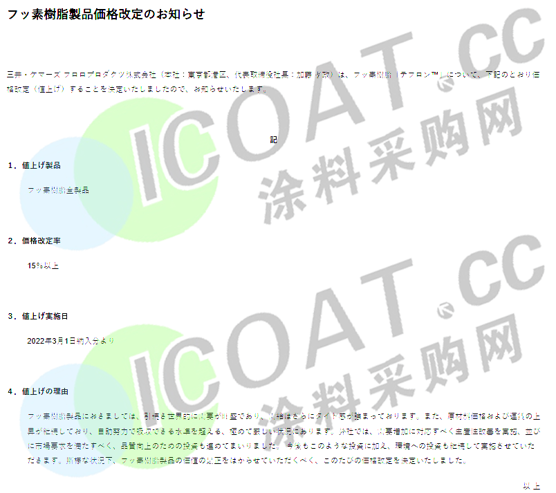 三井科慕发布涨价通知称,自3月1日起,所有氟树脂产品价格上调15%。