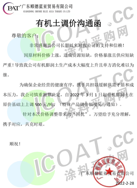 据涂料采购网不完全统计,20余家化工企业发布的涨价函明确了3月以后的涨价,涉及钛白粉、防水材料、涂料、树脂、PP、PE、MDI、表活剂等多种产品。业内人士表示,这与外围局势的紧张和国内形势的严峻有着密切的关系。油价突破100美元/吨,欧洲天然气盘内上涨40%,国内液化天然气月内涨幅超100%,这也让化工人的生产成本无形中提高,且对于能源危机的焦虑持续提升。