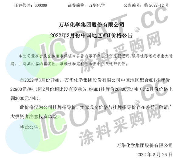 万华化学:自3月份开始,中国地区聚合MDI挂牌价22800元/吨,纯MDI挂牌价26800元/吨(比2月份价格上调3000元/吨)。