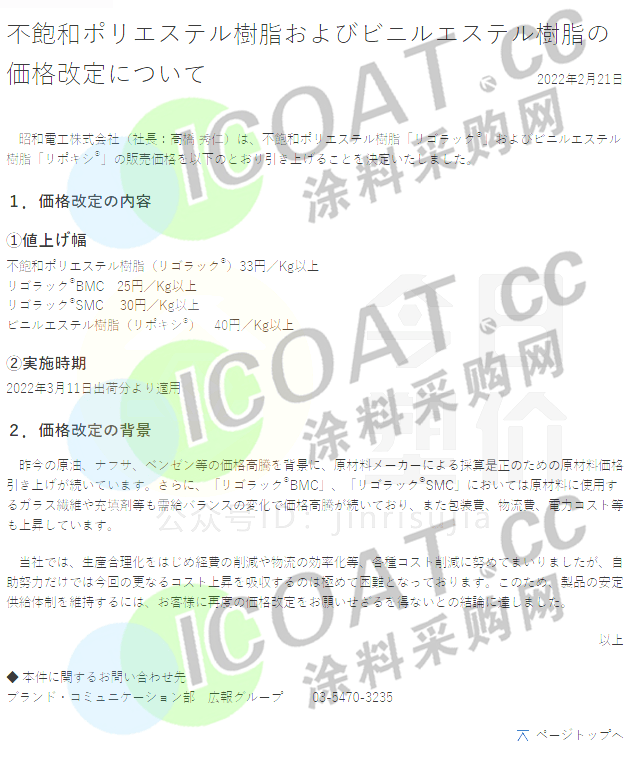DIC:自3月1日起,提高不饱和聚酯聚酯树脂和乙烯基酯树脂等产品的价格,最高上涨40日元/kg(约合2192元/吨)。