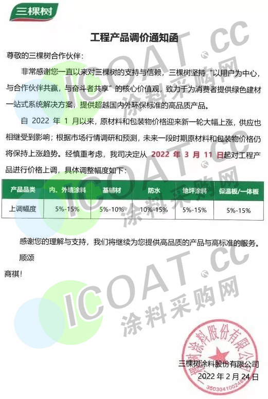 三棵树:自3月11日22:00起,装修期产品价格上调4%—12%,调价产品涵盖乳胶漆、水性木器漆、艺术漆等品类,具体以报货系统为准。