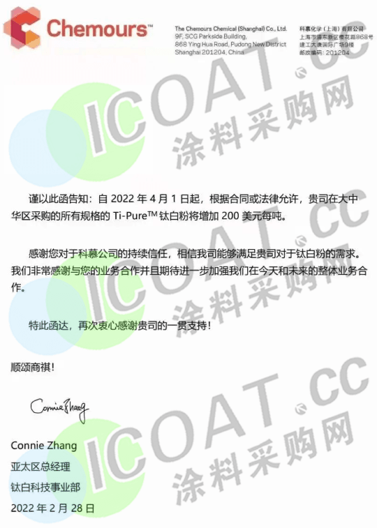科慕:4月1日起,所有规格Ti-Pure™钛白粉将增加200美元/吨。