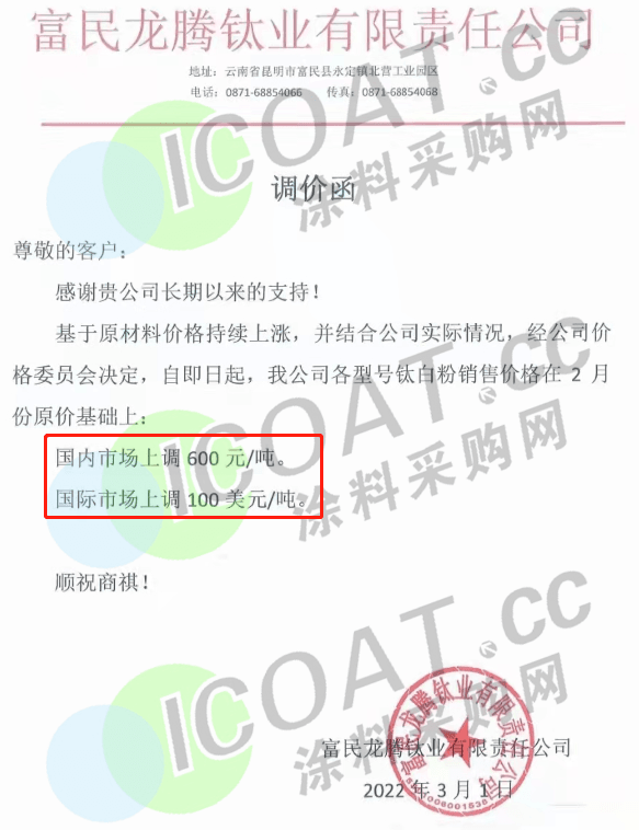昨日(1日),富民龙腾钛业发布调价函,称即日起各型号钛白粉销售价格在2月原价基础上国内上调600元/吨,国际市场上调100元/吨。