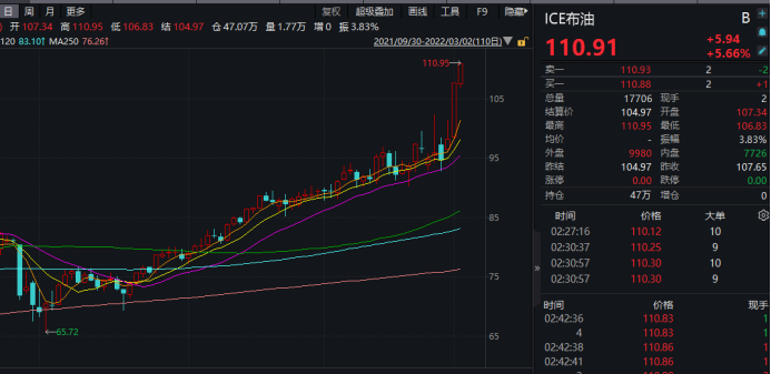 受到俄乌局势紧张等多方面因素的影响,油价进一步大幅上涨。昨日(2日),布伦特原油5月期货开盘突破107美元,盘中最高价达110.54美元/桶,续创2014年以来新高,日内涨近3%;WTI原油站上108美元/桶,日内涨超5%,为2013年以来首次。