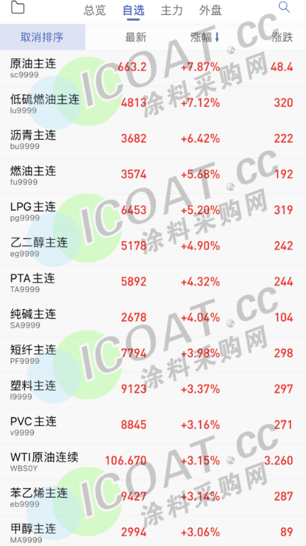 国内能源化工期货板块随之也出现剧烈的攀升,上海原油领涨7.87%,低硫燃油上涨7.12%,沥青上涨6.42%,燃油、LPG上涨超5%,乙二醇、PTA、纯碱上涨超4%,短纤、塑料、PVC、苯乙烯、甲醇、苯乙烯上涨超3%,PP上涨2.9%,可谓是飘红一片。