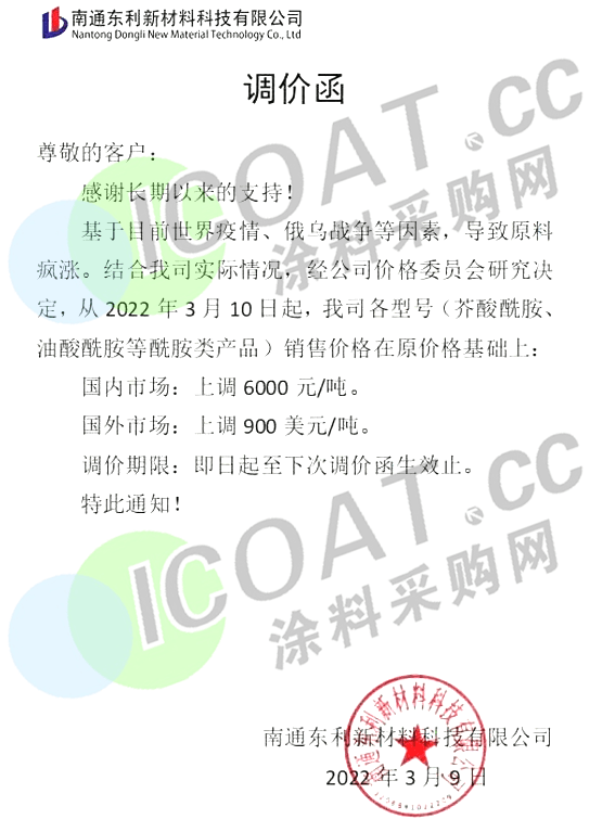 南通东利新材料:3月10日起,各型号(芥酸酰胺、油酸酰胺等酰胺类产品)销售价格在原价格基础上:
