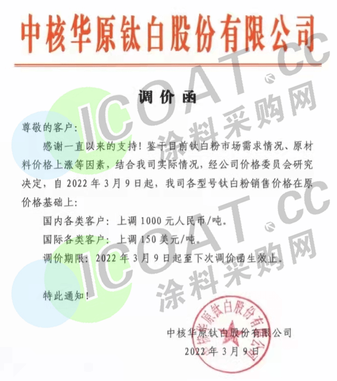 中核华原钛白:3月9日起,各型号钛白粉价格在原价基础上,国内各类客户上调1000元/吨,国际各类客户上调150美元/吨。