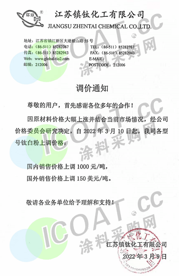 江苏镇钛化工:3月10日起,各型号钛白粉上调价格:国内销售价格上调1000元/吨,国际销售价格上调150美元/吨。