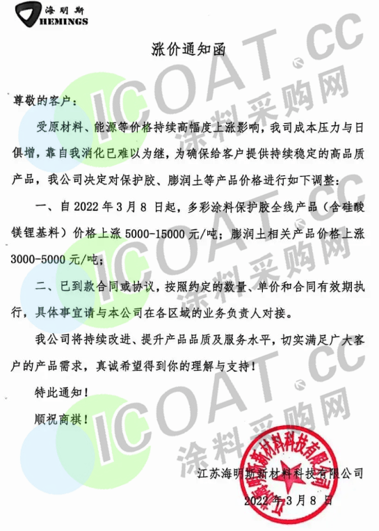 江苏海明斯新材料:多彩涂料保护胶全线产品(含硅酸镁锂基料)价格上涨5000-15000元/吨;膨润土相关产品价格上涨3000-5000元/吨。