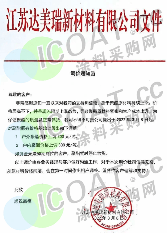 江苏达美瑞新材料:户外聚酯树脂价格上调300元/吨,户内聚酯树脂价格上调300元/吨。
