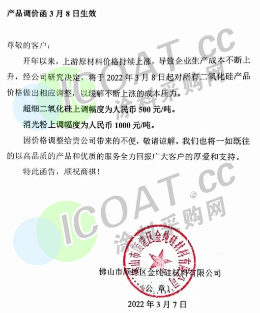 佛山市顺德区金纯硅材料:超细二氧化硅上涨500元/吨,消光粉上涨1000元/吨。