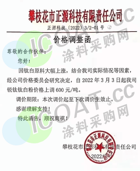 攀枝花正源科技:锐钛型钛白粉价格上调600元/吨。