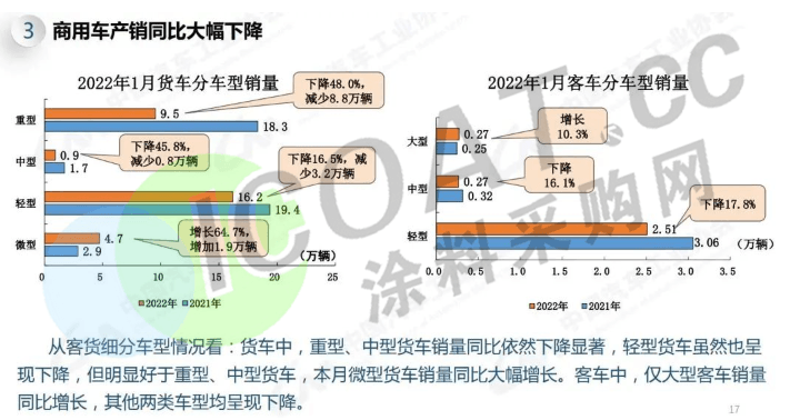 汽车行业也没能逃脱厄运,2022年1月,商用车产销分别完成34.5万辆和34.4万辆,同比分别下降28%和25%。其中,1月重卡销9.5万辆,中卡销0.7万辆,轻卡销1.2万辆,同比分别下降48%、45.8%、16.5%。伴随着政策红利逐步消耗殆尽,以及运输市场需求减弱等因素,商用车市场短期内难以迅速回暖。