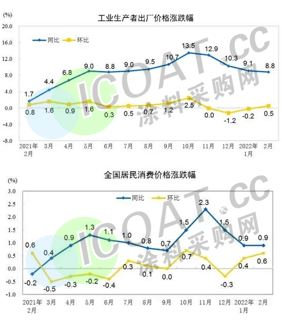 据国家统计局数据,2022年2月份,PPI同比上涨8.8%,环比上涨0.5%。国际原油价格大幅上涨,带动国内石油相关行业价格上行,其中石油开采价格上涨13.5%,精炼石油产品制造价格上涨6.5%,有机化学原料制造价格上涨2.9%。CPI同比上涨0.9%,环比上涨0.6%,且剪刀差的现象已经持续良久,这意味着疫情之下原材料价格飙升,企业生产成本居高不下,但却无法将增加的成本全部通过产品加价转移给终端消费者。更直白地说就是,消费端有效需求太少了,涂料、化工企业不敢随意涨价!