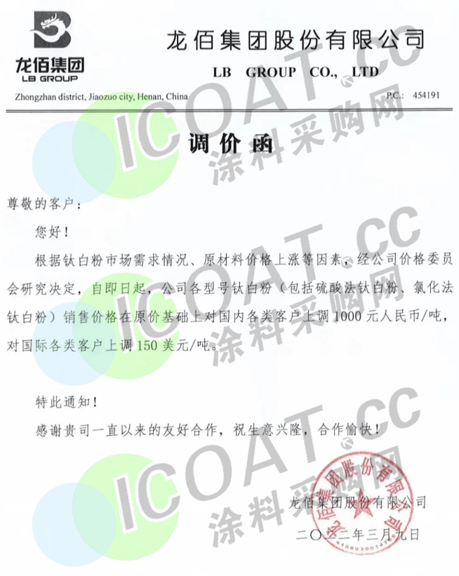 近日,国内钛白粉龙头企业龙佰集团公告,自即日起各型号钛白粉(包括硫酸法钛白粉、氯化法钛白粉)销售价格在原价基础上对国内各类客户上调1000元人民币/吨,对国际各类客户上调150美元/吨。