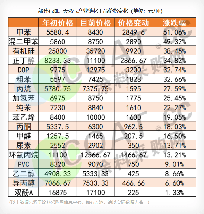 这也解释了为何近期近百种化工品火速加入涨价队列中,不到一个季度吨价就上涨了成千上万元的情况。另外石油、天然气产业链上,有机硅、甲苯、混二甲苯、苯乙烯等多种化工品价格呈上涨趋势。其中甲苯上涨近3000元/吨,涨幅超过50%,混二甲苯涨幅超过40%,有机硅、正丁醇等涨幅超过20%,不可谓不惊人。