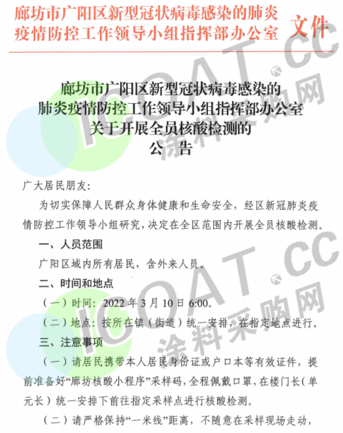 据涂料采购网不完全统计,目前已有十几个省市地区加严了疫情管控措施,陕西、天津、吉林、内蒙古等多个地区开展了全员核酸检测,且随着疫情蔓延,不少地区也开始多措并举“严防死守”。