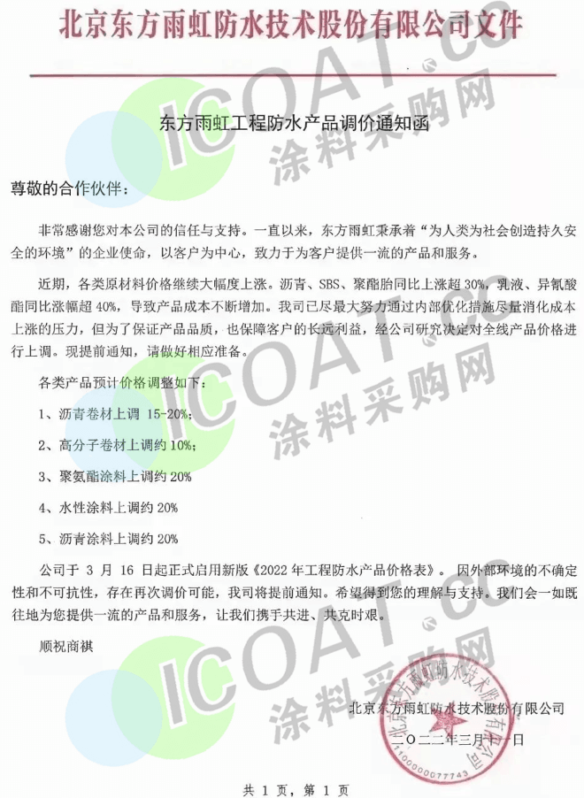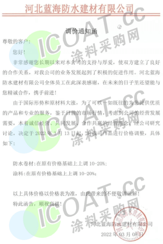 明确表示,将于3月16日起正式启用新版《2022年工程防水产品价格表》,因外部环境的不确定性和不可抗性,存在再次调价可能。