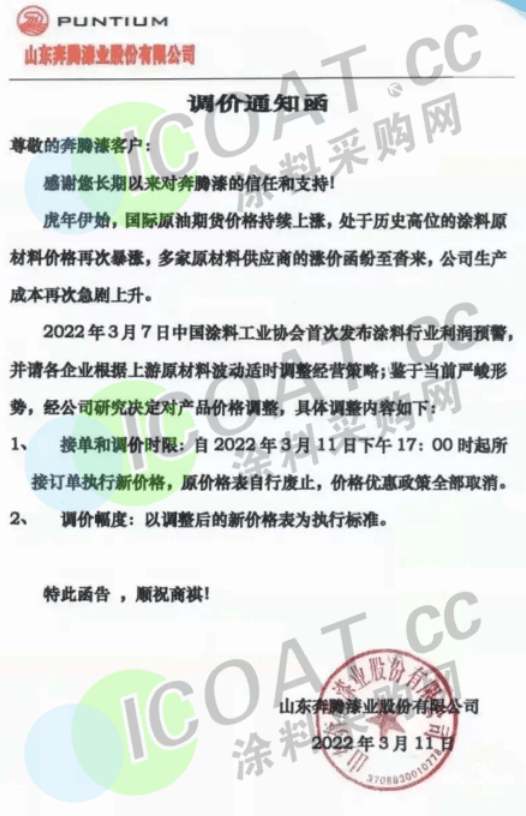 山东奔腾漆业:3月11日下午17:00时起所接订单执行新价格,原价格表自行废止,价格优惠政策全部取消。调价幅度以调整后的新价格表为执行标准。