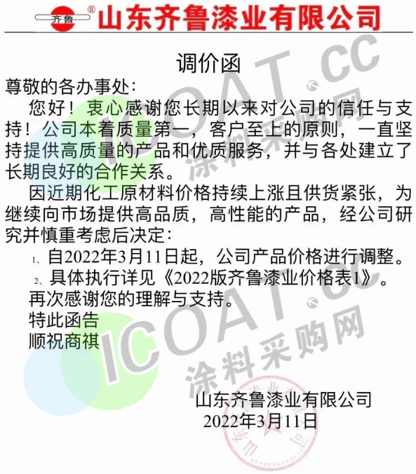 山东齐鲁漆业:3月11日起,公司产品价格进行调整(具体执行价格详见价格表)。