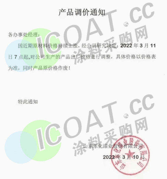 山东乐化漆业:3月11日7点起,产品出厂价格进行调整,具体价格以价格表为准。