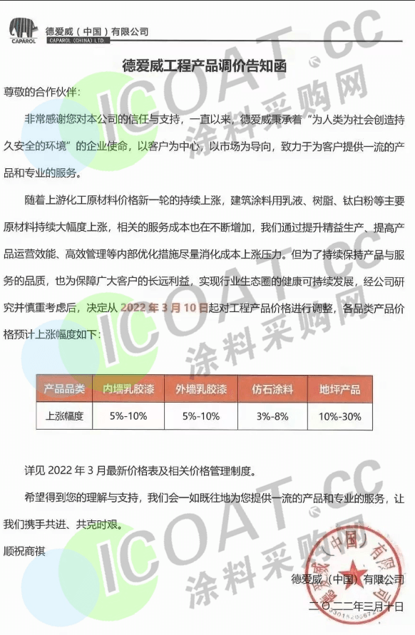 德爱威:工程产品价格上调,内墙乳胶漆上涨5-10%,外墙乳胶漆上涨5-10%,仿石涂料上涨3-8%,地坪产品上涨10-30%。