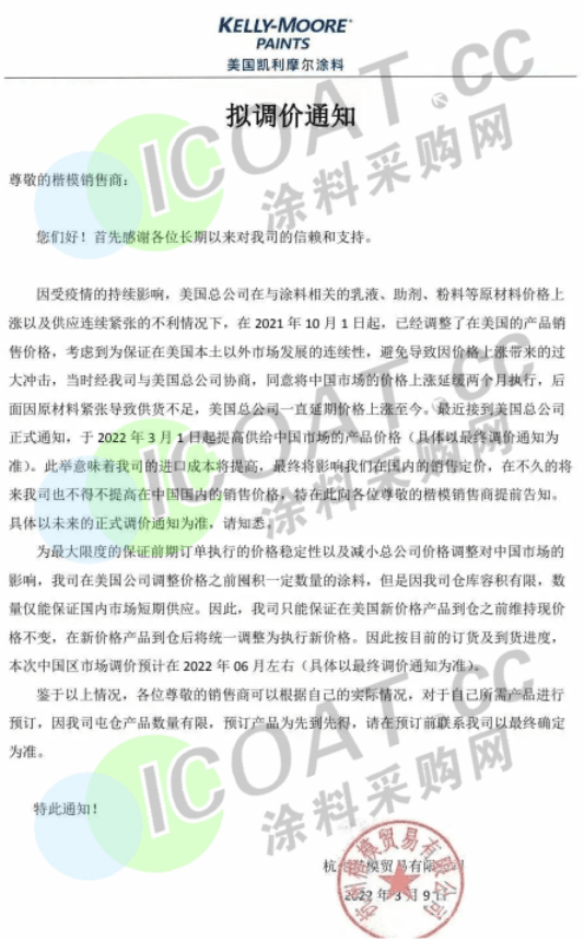美国凯利摩尔涂料:美国总公司新价格产品到仓之前,中国区市场现有产品价格维持不变,新价格产品到仓后,统一执行新价格,调价预计在2022年6月左右(具体以最终调价通知为准)。
