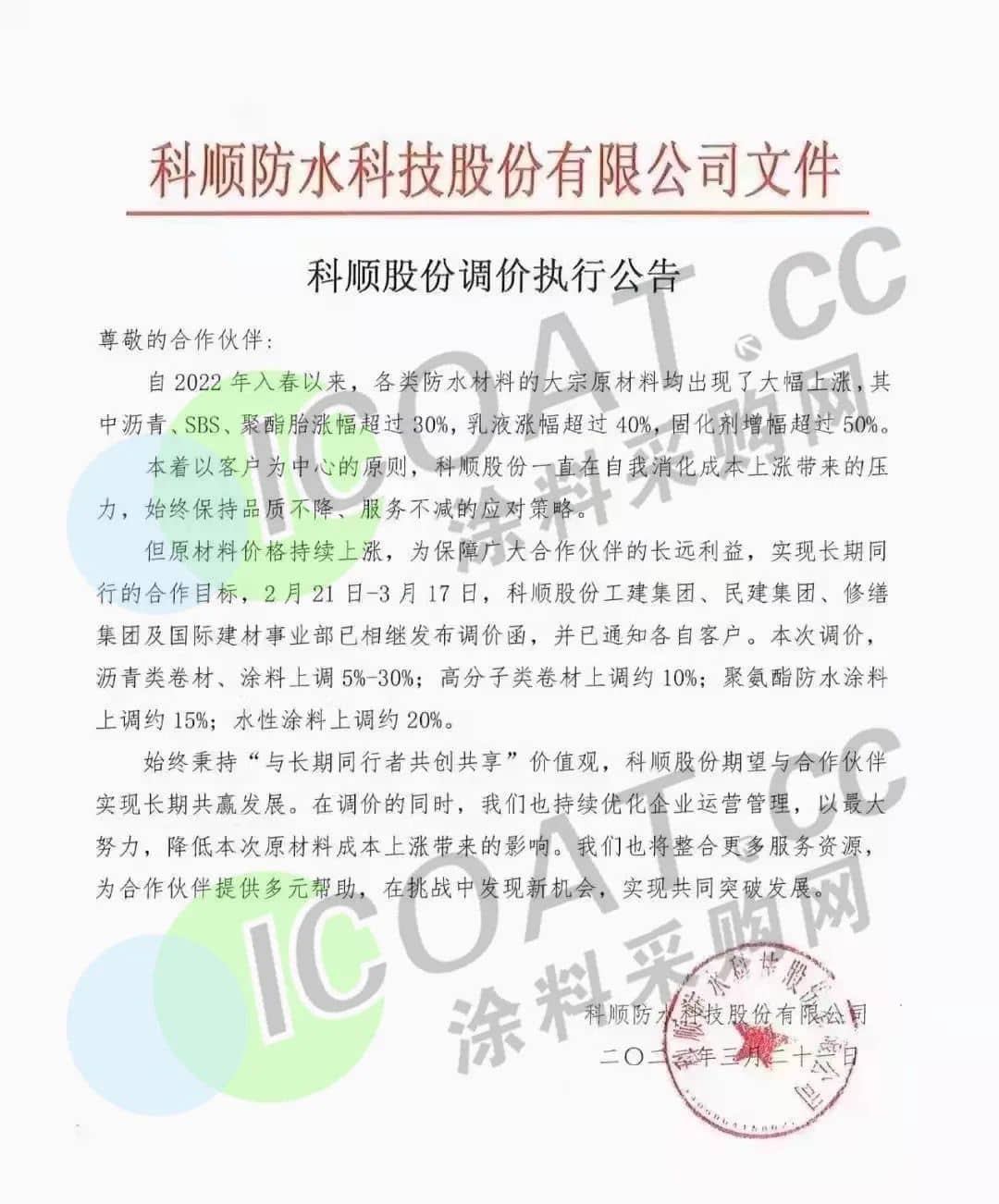 据涂料采购网了解,近日科顺股份发布调价公告称:因原材料价格持续上涨,为保障广大合作伙伴的长远利益,实现长期同行的合作目标,科顺股份工建集团、民建集团、修缮集团及国际建材事业部已相继发布调价函,并已通知各自客户。本次调价,沥青类卷材、涂料上调5%-30%;高分子类卷材上调约10%;聚氨酯防水涂料上调约15%;水性涂料上调约20%。