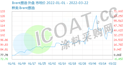 科顺的价格上涨并不是个例,近期多家涂料企业发函宣涨,主要原因都是原料成本压力增大。近期地缘政治冲突持续升级,国际原油价格也仍在高位波动。纽约商品交易所4月交货的轻质原油期货价格上涨7.42美元,收于每桶112.12美元,涨幅为7.09%;5月交货的伦敦布伦特原油期货价格上涨7.69美元,收于每桶115.62美元,涨幅为7.12%。